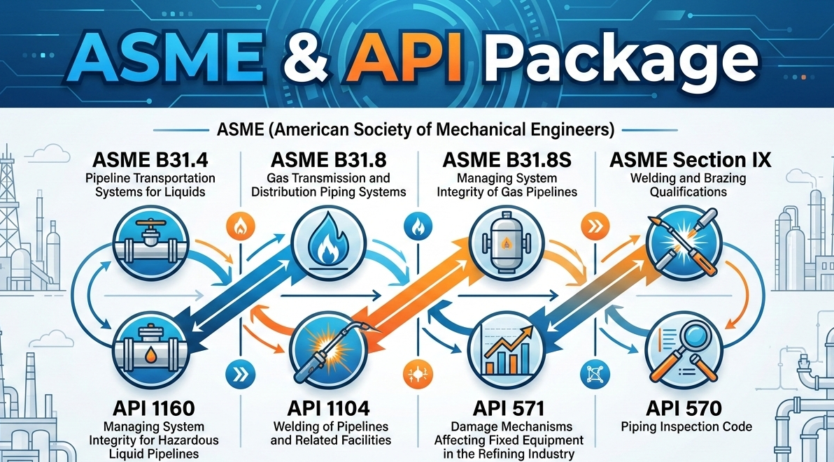 ASME & API Package Course ASME B31.4, ASME B31.8, ASME B31.8S, ASME IX, API 1160, API 1104, API 571 and API 570Pipelines play a vital role in our economy. Pipeline operators have a duty to preserve public safety and the environment. Responsible employees of a pipeline operator have a duty to thoroughly understand and rigorously ... |